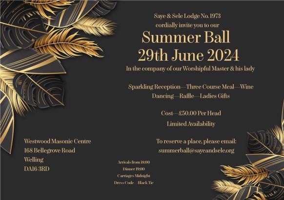 Saye and Sele's 'Summer Ball' is planned for the 29th June 2024 at the Westwood Masonic Centre, Welling. It promises to be a superb evening of conversation, feasting, and dancing.